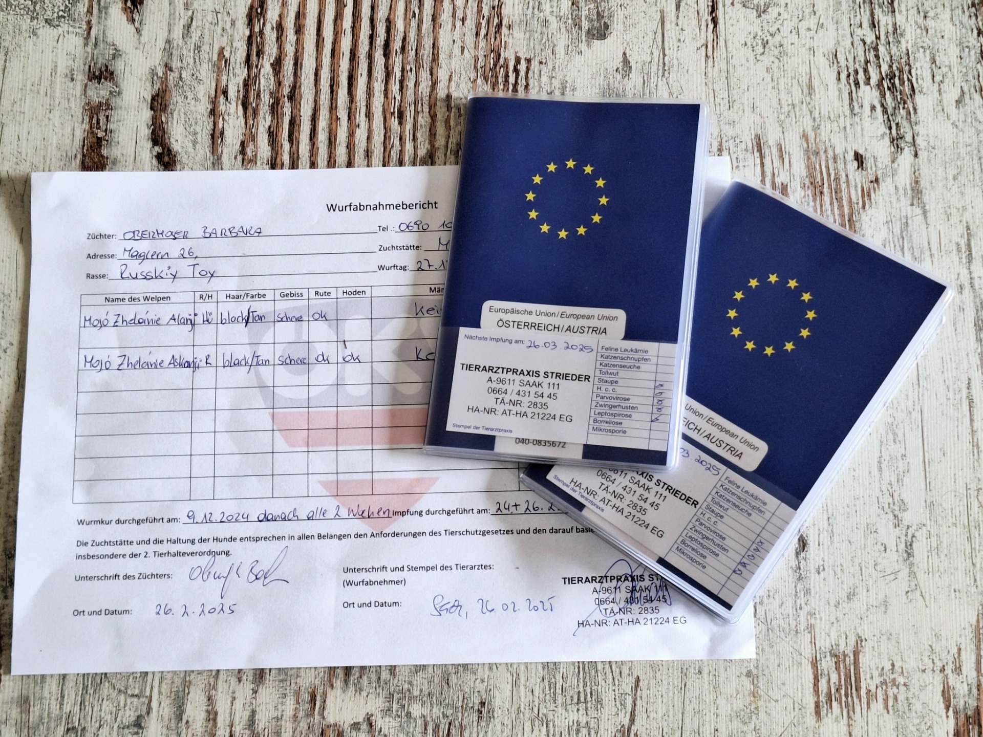 Es gab die zweite Impfung, den Eintrag in Animaldata, den EU-Heimtierausweis samt Chipnummer, den DNA-Test sowie eine ausführliche Untersuchung und Wurfabnahme durch den zuständigen Facharzt.